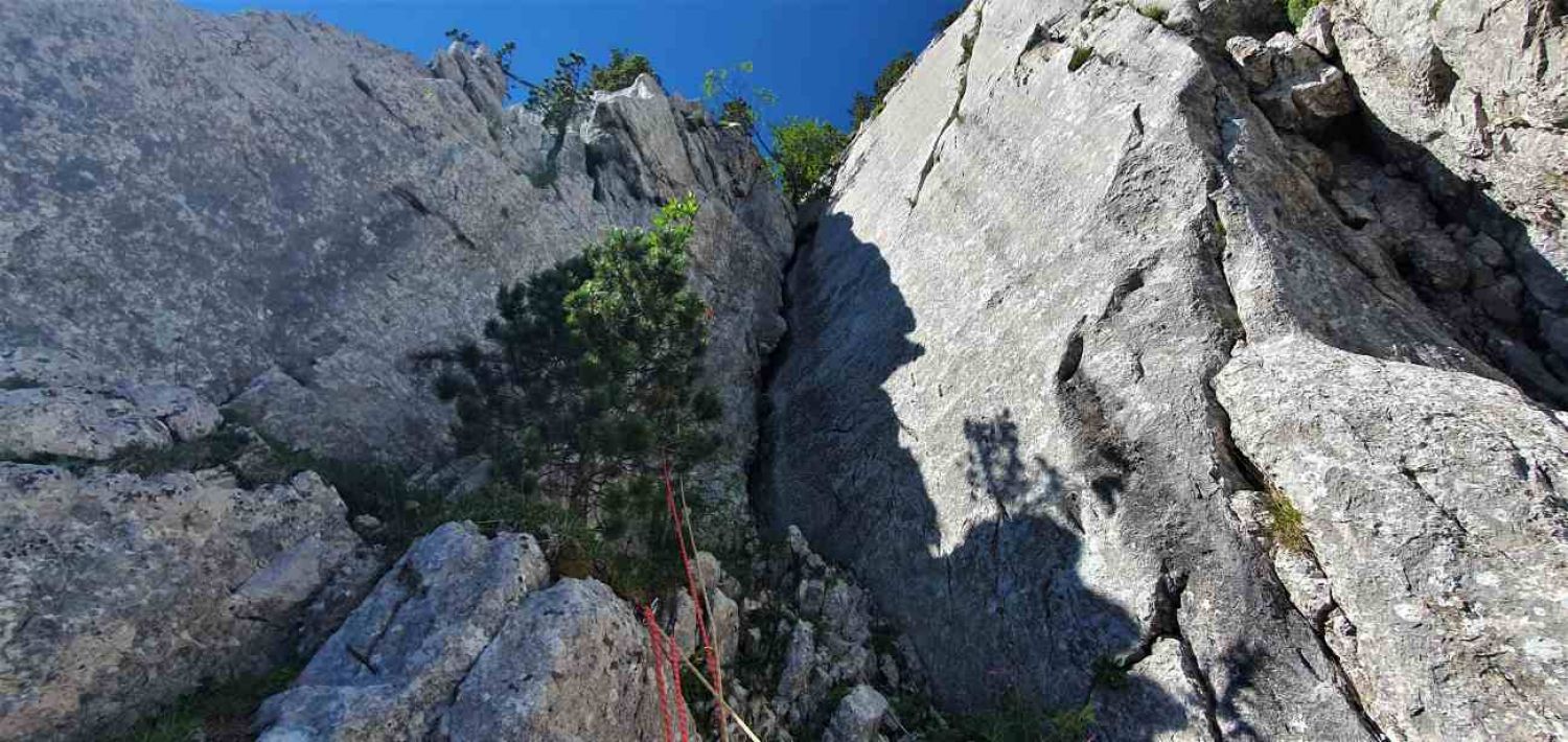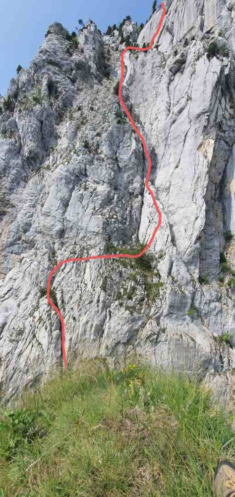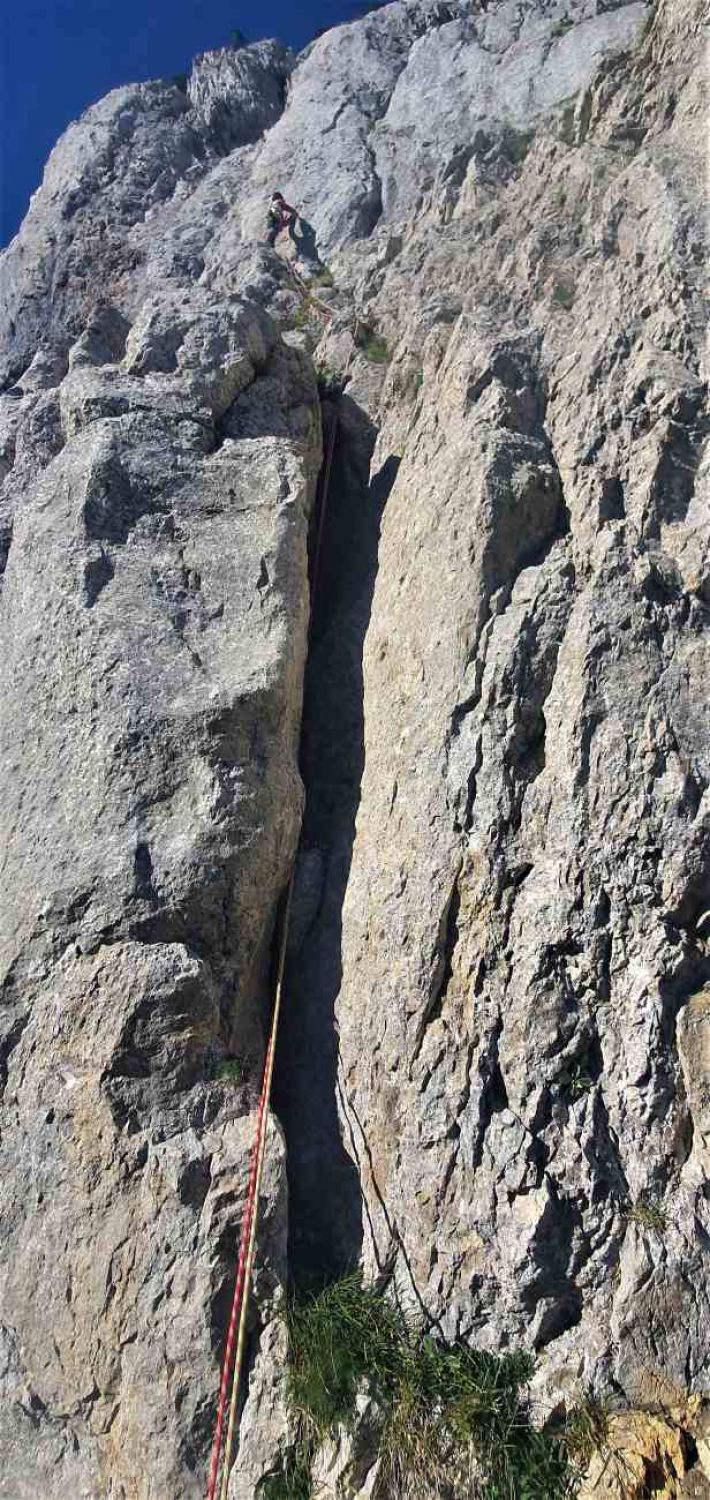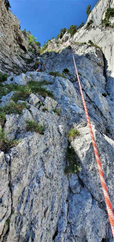 Cette voie de 140 m été côté D-, avec un développé de 140 m pour 7 pitons en place !