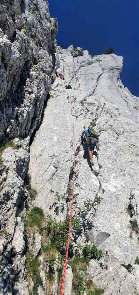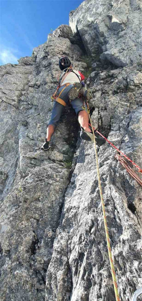 Les longueurs remarquables de la voie Payot méritent une attention particulière. La L2 et la L5, mentionnées pour la beauté de leur rocher, offrent une escalade de grande qualité sur un calcaire compact qui contraste avec les sections plus délicates. Ces passages procurent des sensations de grimpe exceptionnelles, avec une adhérence remarquable et des prises franches qui permettent une progression fluide. Entre ces sections de choix, le rocher reste effectivement plus délicat et demande une vigilance constante dans le choix des prises et des appuis. Cette alternance entre rocher solide et zones plus friables caractérise l'escalade dans les Bornes et développe le sens de l'observation indispensable en alpinisme traditionnel. Pieric guide de haute-montagne veille particulièrement à la sécurité dans ces passages délicats, n'hésitant pas à renforcer les assurages si nécessaire. Le rééquipement en plaquettes modernes facilite grandement la progression par rapport aux sept pitons historiques qui équipaient initialement la voie.