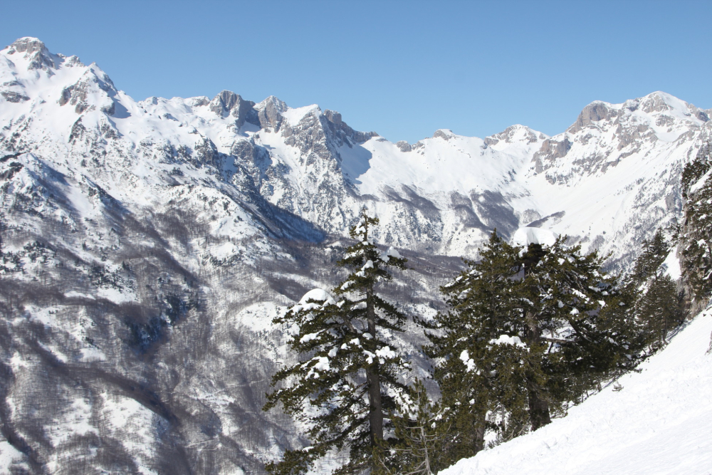 Pour la première, il s'agit d'une très belle et profonde vallée dont le fond culmine approximativement à 1000 m, qui est classée Parc National, et dont la propreté tranche avec le reste du pays malheureusement... Une vallée à route unique, surplombée par des pentes de 1500 m de dénivelé, plus ou moins raides. Il y en a pour tous les goûts lors de ce voyage ski de randonnée en Albanie : des pentes douces, comme pour le col de Muttons dans le Cirque Blanc; des pentes un peu plus pentues comme le Rrogami; et de beaux couloirs à découvrir, explorer! L'orientation de la vallée dans un axe Est - Ouest ouvre le choix pour les meilleures conditions de ski de randonnée, en choisissant chaque jour entre face Sud et face Nord. Cette flexibilité est l'un des atouts majeurs de notre coaching voyage à ski.